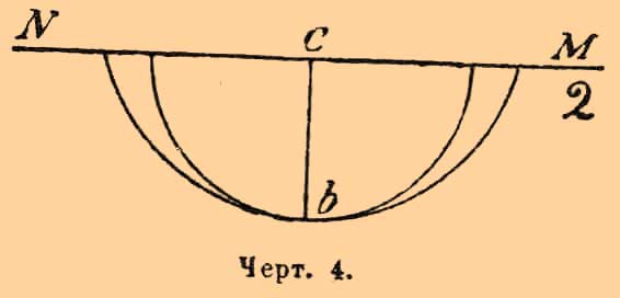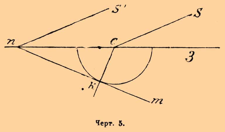 Если на поверхность MN стекла (черт. 5) падают параллельные лучи Sc и S'n, то первый дойдет до точки с прежде, чем второй до точки n, и потому из с уже успеет образоваться полушаровая волна, когда колебание второго луча только что коснулось точки n. Линия nm есть касательная к шару; линия ck, перпендикулярная к касательной, покажет направление преломленного луча. Если же лучи Sс и S'n попадают на двупреломляющий кристалл, то образуются из точки с две волны, изображенные на черт. 6 полукругом и полуэллипсом.