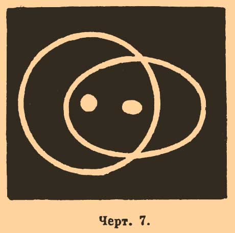 Существование шаровой и эллипсоидальной волн наглядно доказывается следующим опытом (Десен — Desains). Параллельные лучи принимаются на маленькое выпуклое стекло, покрытое непрозрачной пластинкой с кольцевым прорезом и маленьким круглым отверстием в центре. За стеклом образуется полый световой конус, которого вершина придется в главном фокусе стекла; кроме того, по оси этого конуса проходит тонкий пучок лучей. Это стекло, у которого фокусное расстояние должно быть очень коротко, помещается перед одноосным кристаллом, так чтобы фокус пришелся на поверхности кристалла, а ось светового конуса была бы перпендикуляpна к этой поверхности. Лучи после пересечения в фокусе образуют два конуса в кристалле — один с круговым, другой с эллиптическим кольцевыми основаниями, что и обнаруживается по выходе их из второй грани кристалла, которая должна быть параллельна первой. Осевой пучок конуса падающих лучей дает два круглых пятна в центре фигуры. В зависимости от положения граней кристалла относительно его оптической оси образуются или круг и эллипс, как показано на черт. 7, или два концентрические круга, или же круг и эллипс, имеющие общий центр.