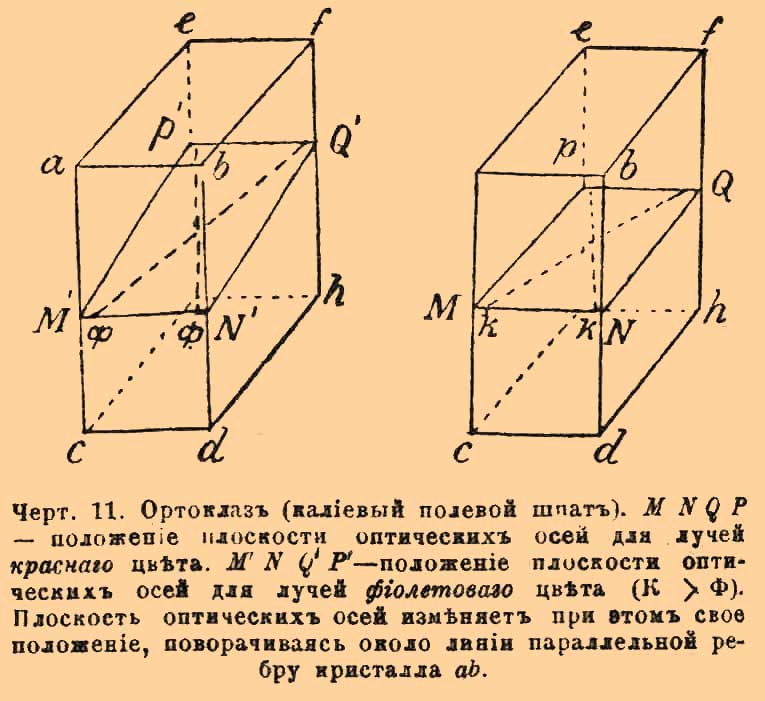 Черт. 11. Ортоклаз (калиевый полевой шпат). M N Q P — положение плоскости оптических осей для лучей красного цвета. M' N' Q' P' — положение плоскости оптических осей для лучей фиолетового цвета (К > Ф). Плоскость оптических осей изменяет при этом свое положение, поворачиваясь около линии, параллельной ребру кристалла ab.