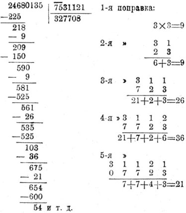 2) Правила Д. чисел и полиномов излагаются в руководствах; указания относительно приемов, употреблявшихся при Д. в древние и средние века, можно найти, между прочим, у Кантора в " Vorlesungen ü ber Geschichte der Mathematik" (Лпц., 1880—92). Из правил приближенного Д. заслуживают внимания так называемое сокращенное Д. и Д. Фурье, названное им division ordonn ée ("Analyse des équations déterminé es", 1831). В сокращенном Д. при составлении произведений найденных цифр частного на делителя число знаков последнего постепенно уменьшается на одну цифру; при этом поступают, как в следующем примере: