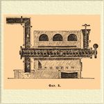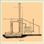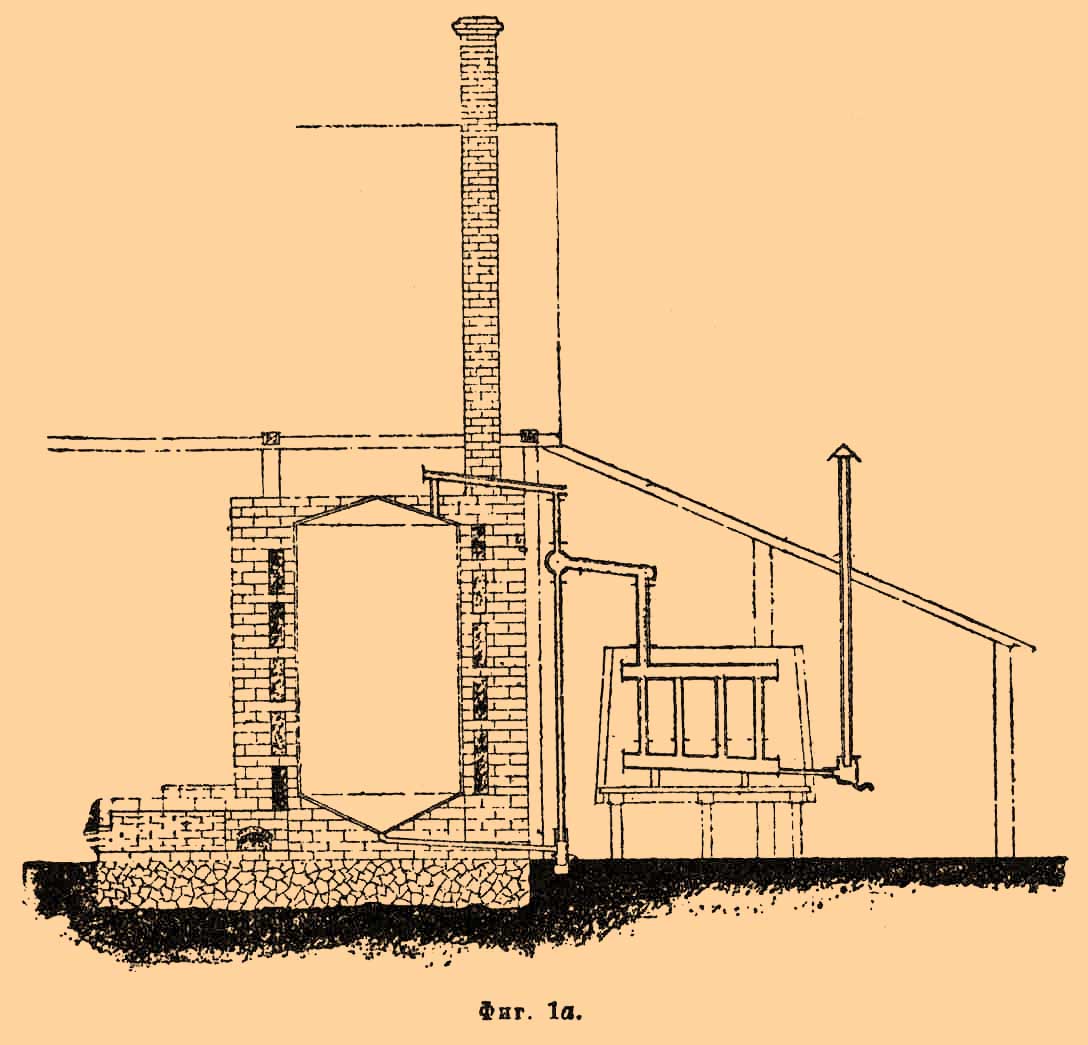 Котлы — чугунные, конической формы, с отъемной крышкой и отверстием внизу (обыкновенные размеры: диаметр вверху 20½ врш., внизу — 13 врш., высота — 20 врш., диаметр нижнего отверстия 2¼ врш., вес 10 пд., вес крышки 3 пд.). Нагревание котлов производится на кустарных заводах самым несовершенным способом. Каждый котел устанавливается на каменном фундаменте с отверстием в центре, на которое наставляется отверстие котла; к центральному каналу в фундаменте точно так же, как при кожуховых печах, подкладывается деревянная труба, расположенная наклонно и по которой продукты перегонки отводятся в приемный чан, поставленный в яме. На фундаменте вокруг котла выводятся стенки высотой до краев котла; промежуток между кирпичной стевкой и стенкой котла представляет топочное и нагревательное пространство; для топки в кирпичной стенке имеется отверстие внизу, для выхода дыма — вверху. Устанавливают также по нескольку котлов (3, 4, 6 и 9) в одном очаге, также самого простого устройства. В этом случае так называемые коренные трубы, т. е. отводные от нескольких котлов (3-6), соединяют с одной общей — выходной трубой.