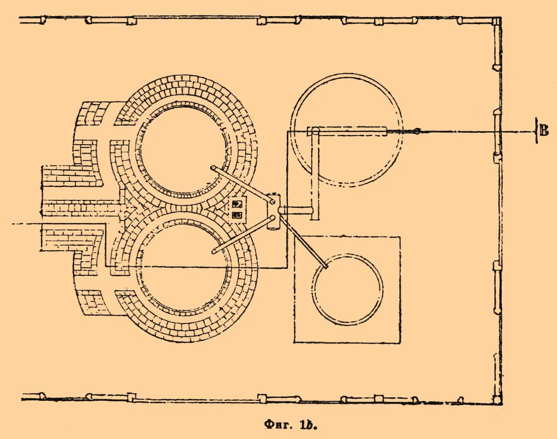 Цилиндрическая реторта из котельного железа имеет 5½ арш. высоты, 3 арш. 5 врш. в диаметре, вмещает 1¼ куб. саж. осмола. Оба дна конические, и каждое снабжено отводной трубкой; верхняя трубка служит для отвода летучих паров, нижняя — для дегтя. Верхняя трубка входит в горизонтально расположенную широкую трубу, в которой осаждаются труднолетучие вещества, стекающие по вертикальной трубке в стакан с носом и по наполнении последнего в приемный чан; вертикальная трубка должна быть погружена в жидкость в стакане, чтобы образовать гидравлический запор. С нижней частью этой же вертикальной трубки соединена нижняя отводная труба из реторты, служащая для стока дегтя. Летучие пары, не сгустившиеся в верхнем горизонтальном приемнике, поступают в холодильник, где и сгущаются. Реторта снабжена двумя лазами, верхним и нижним, для нагрузки и разгрузки. На рисунке представлено такое устройство печи, при котором топка помещается не в главной кладке, а сбоку; такое расположение представляет то удобство, что при ремонте топки (который приходится производить чаще всего) не требуется разбирать кладку самой печи. Огонь из топки поступает через соединительный боров прямо в спиральный дымовой ход около боковых стенок реторты и, дойдя доверху, уходит в дымовую трубу. На некоторых заводах, как представлено на рисунке, боковые стенки обкладывают кирпичом (в ¼ кирпича) в видах более продолжительного сохранения реторты, но едва ли это можно признать рациональным, так как при такой обкладке реторта уже слишком медленно прогревается. Реторты того же типа для перегонки лиственных пород отличаются от предыдущей тем, что имеют только одну отводную трубу вверху, и при вмазке в печи огонь пускают с начала по дымоходам под дном реторты, а затем уже он переходит в спиральный ход около боковых стенок реторты.