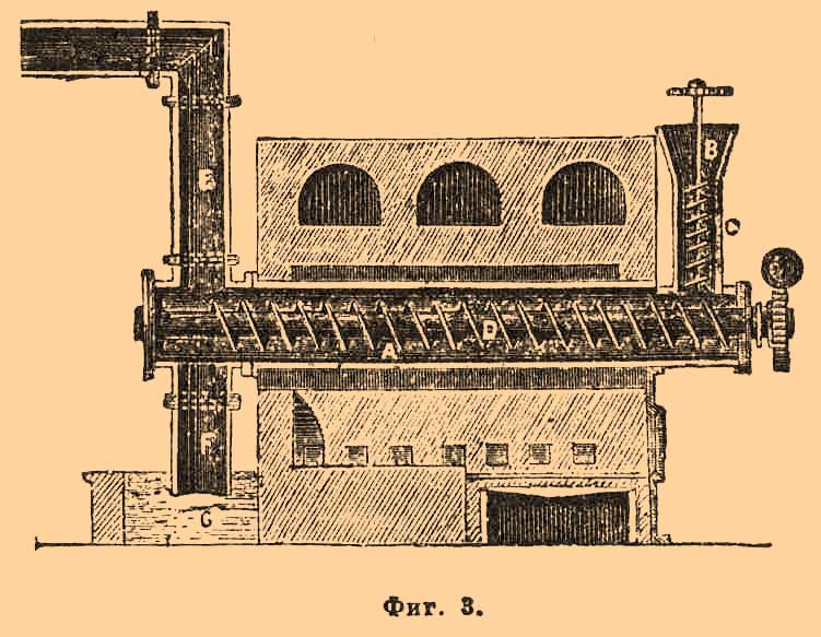 Перегоняемый материал поступает в приемную воронку В, помещенную к трубе С, в которой вращается винт; отсюда материал поступает в горизонтальную цилиндрическую реторту, нагреваемую в печи и в которой материал вращающимся винтом D передвигается к другому концу, обугливаясь по пути, и обугленный падает через трубу F в чан с водой G. Смола стекает также через эту же трубу; летучие продукты выделяются через отводную трубу Е и отводятся в холодильник. Предложенные разными лицами для сухой перегонки аппараты других типов, насколько мне известно, не применяются в практике.