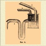 На фиг. 1 при вертикальной реторте представлен холодильник особого типа, предложенный Кирпичниковым и встречающийся на наших заводах. Он состоит из 2 труб большого диаметра, закрытых по концам и соединенных между собой несколькими трубками малого диаметра. Вся эта система труб помещается в деревянном чане с водой. Пары поступают в верхнюю трубу, из которой по тонким соединительным трубкам переходят в нижнюю, а из последней сгустившаяся жидкость стекает по отводной трубке в приемник. Холодильные трубы лучше всего употреблять медные. Длина их должна быть очень значительна, напр. для нескольких реторт общей вместимости в 18-20 куб. м; холодильные трубы должны иметь, по Бершу, до 40 м длины при диаметре в 15 см. Обыкновенно близ выходного конца холодильной трубы вставляют в нее вертикальную открытую трубку для отвода выделяющихся вместе с дистиллятом газов. Если эти газы утилизируются для нагревания реторт, то конец холодильной трубки должен быть вставлен в закрытый сосуд так, чтобы он был погружен несколько в жидкость для образования гидравлического запора, необходимого в том случае, если газы прямо отводятся в топку [Это необходимо для устранения взрыва газов в аппарате, так как огонь может передаться из топки в перегонный аппарат.], жидкость в закрытом сосуде поддерживается постоянно на одном уровне, и лишняя постоянно, по сифонной трубке, стекает в приемный резервуар. Из таких приспособлений наибольшего внимания заслуживает предложенное Бершем (фиг. 4).