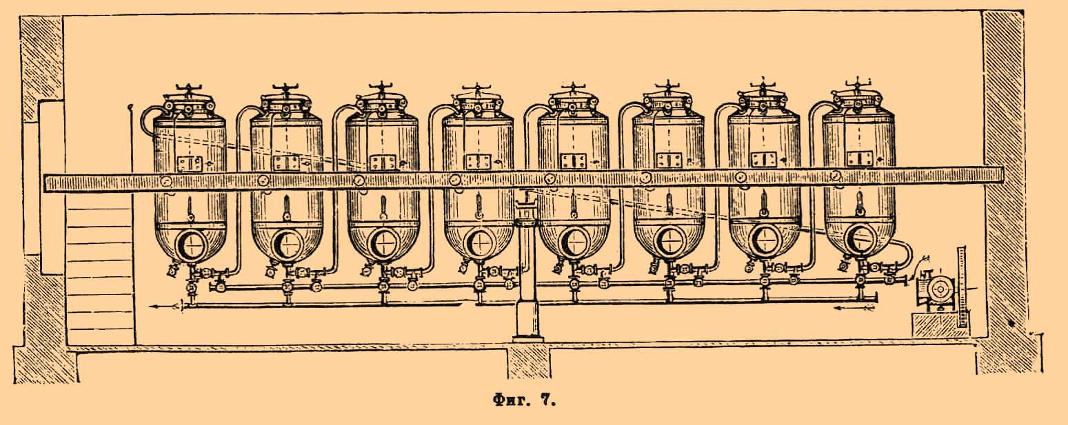 Котел А укреплен в подшипниках а на двух станинах В. Через один из этих подшипников входит внутрь котла паропроводная труба g, оканчивающаяся кольцом с рядом мелких отверстий. Внизу котла помещается ложное дырчатое дно, на которое и закладывается грубая ткань, а поверх ее — измельченное экстрагируемое дерево. Крышка с снабжается предохранительным клапаном, манометром и наглухо прикрепляется к котлу с помощью откидных болтов d, подниматься она может с помощью болтов и противовеса. Внизу котла находится спускная труба h с краном i. Работа в таком котле идет следующим образом: в него загружаются стружки, наливается необходимое количество воды, закрепляется крышка и впускается по пароприточной трубе пар при поднятом предохранительном клапане или открытом воздушном кранике до тех пор, пока пар не будет выделяться наружу, что укажет, что весь воздух уже вытеснен из котла. Тогда закрывают краник или опускают предохранительный клапан и продолжают пускать пар до тех пор, пока давление не подымется до половины или одной атмосферы. Жидкости дают кипеть в течение 30-40 минут, закрывают пароприточный кран и давлением, существующим в котле, спускают полученный экстракт по трубе h на выпарку. В это же время в котел вновь наливают воды, пускают пар и экстрагируют второй раз, а затем последовательно и третий. Удельный вес первого экстракта бывает большей частью около 1,010; второго — 1,005; третьего — не больше 1,0025. В котел диаметром 1000 мм входит зараз 50 кг измельченного дерева. В настоящее время для приготовления экстрактов красильных деревьев часто применяется диффузия — прием, который давно уже практикуется для извлечения сахара из свеклы. Для этой цели служит так называемая диффузионная батарея (фиг. 7), состоящая из 6 — 8 — 12 цилиндрических медных котлов, установленных в ряд на деревянном или металлическом постаменте.