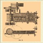 Движение от паровой машины передается помощью шкивов ZZ зубчатым колесам Х и J и валу W, на котором укрепляется барабан с ножами D. Измельчаемое дерево помещается на железной платформе N, на которой укрепляется также пластинка C, служащая как для пододвигания дерева, так и для надавливания к ножам барабана. Производительность этой машины составляет около 1000 кг стружек за 12 час. работы.