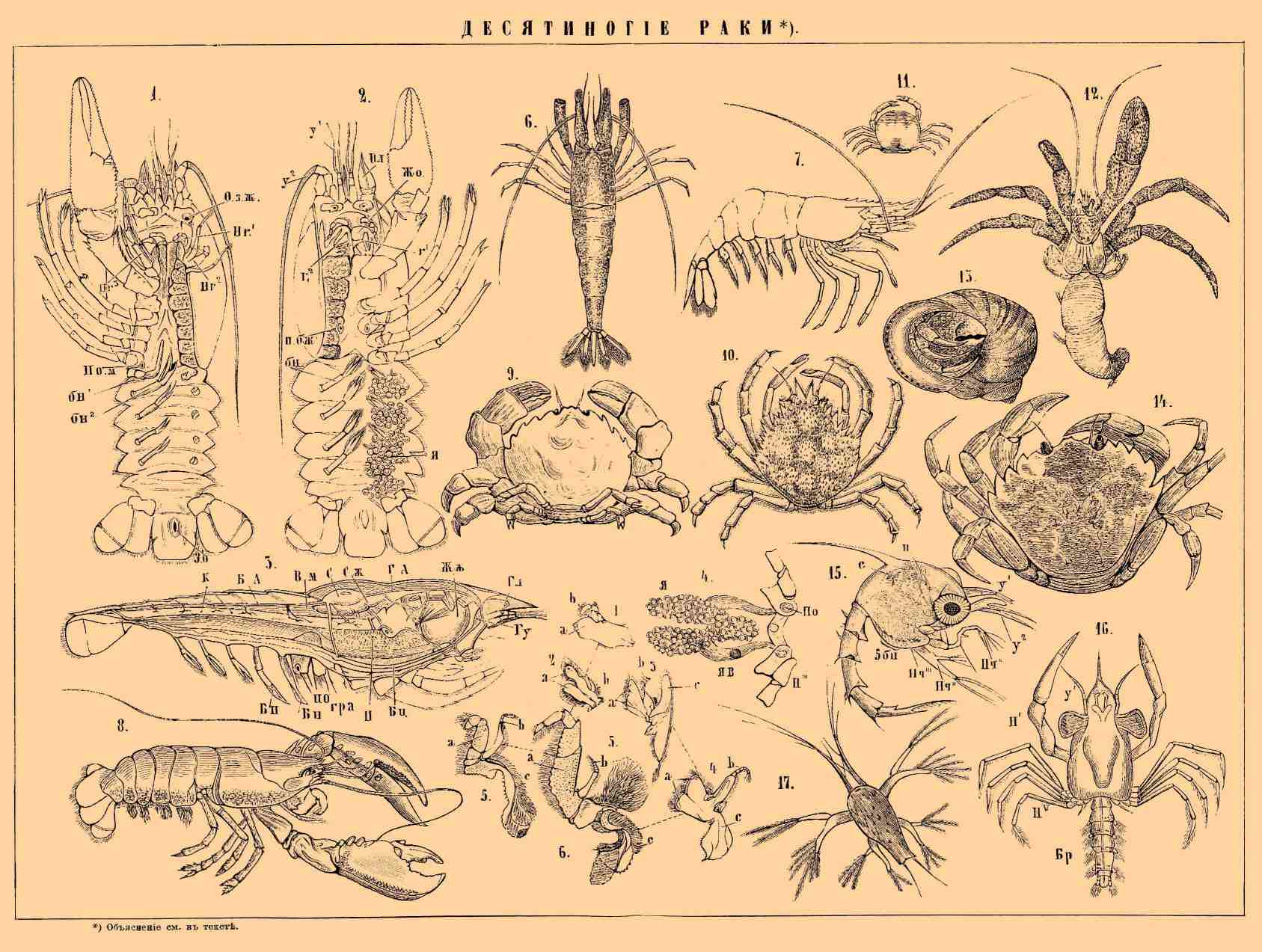1) Речной рак (Astacus fluviatilis), самец снизу; 2) самка снизу; на обоих рисунках часть придатков удалена для того, чтобы были видны прикрытые ими части: у 1 — первая пара усиков, у 2 — вторая пара усиков, Жо — верхние челюсти или жвала; r 1 и r 2 — первая и вторая пара нижних челюстей, Hr 1, Hr2 и Hr 3 — три пары челюстных ножек, Пл — пластинка или чешуйка усиков 2-й пары, бн — брюшные ножки; бн 1 и бн 3 — первые пары брюшных ножек самца, служащие органами совокупления, Пом — мужское половое отверстие, пож — женское подовое отверстие, Озж — отверстие зеленой железы, Зо — заднепроходное отверстие, Я — яйца, прикрепленные к брюшным ножкам самки (нарисованы лишь с одной стороны). 3) Расположение внутренних органов речного рака сбоку; Гл — глаз, Гу — головной нервный узел, Жж — желудок, ГА — головная аорта, Сж — семенные железы, С — сердце, Вм — брюшные мускулы, БА — брюшная аорта, К — кишка, Бц — брюшная нервная цепочка, П — печень, гра — грудная артерия, По — половое отверстие (мужское), Бн — брюшные ножки. 4) Женские половые органы речного рака, Я — яичник, Яв — яйцеводы, По — половое отверстие, Н''' — основные членики 3-й пары ног. 5) Ротовые органы речного рака; 1 — верхние челюсти; 2 и 3 нижние; 4, 5 и 6 — челюстные ножки; а — жевательная часть, б — щупальца, с — жаберные придатки. 6) Гарнель (Crangon vulgaris). 7) Кревет (Palaemon serratus). 8) Омар (Homarus vulgaris). 9) Дромия (Dromia vulgaris). 10) Морской паук, или майя (Maja squinado). 11) Pinnotheres pisum. 12) Рак-отшельник или пагур (Pagurus bernhardus); 13) Рак-отшельник, втянувшийся в раковину; видны клешни и передние пары ходильных ножек; 14) Обыкновенный краб (Carcinus moenas). 15) Зоеа (Zoëa), y1 и y2 — усики первой и второй пары, Нч, Нч" и Нч''' — челюстные ножки, 5н — 5 пар зачаточных грудных ножек, с — сердце (сильно увеличено). 16) Мегалопа (Megalopa); y1 — первая пара усиков, Н — первая пара грудных ножек, Н — пятая пара грудных ножек, Бр — брюшко (увеличено), 17) Науплиус Penaeus (сильно увеличено).