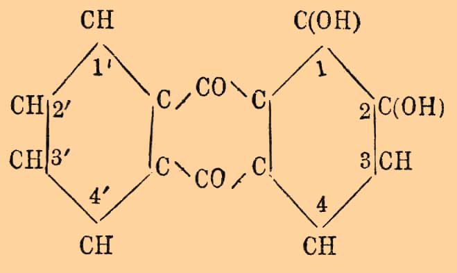 т. е., в ализарине гидроксильные группы находятся в одном и том же бензольном кольце, в ортоположении (1, 2). В пурпуроксантине или ксантопурпурине эти группы стоят в метаположении (1, 3), в хинизарине — в параположении (1, 4); антраруфин представляет Д. (1, 4'), т. е. замещение гидроксильными группами произошло уже в различных бензольных кольцах и т. д. См. также Оксиантрахиноны.