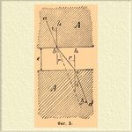 Когда поверхность раздела двух сред А и В есть плоскость и среда В ограничена с противоположной стороны плоскостью, параллельной первой плоскости раздела ее от среды А, а за ней следует опять та же первая среда A, то луч, дважды преломившись, выйдет, как показывает рассуждение и подтверждает опыт, параллельным своему первоначальному направлению в первой среде, но перемещенным относительно его на некоторую величину К — вниз, если среда В более плотная (фиг. 4), и — вверх, если она менее плотная (фиг. 5), причем