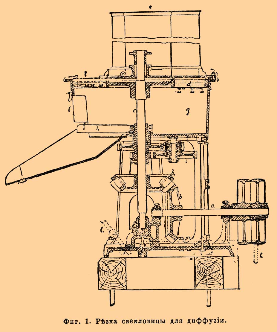 Свекла для извлечения из нее сока посредством Д. должна быть измельчена на тонкие и узкие пластинки, или ленты, называемые резкой, или стружкой. Наиболее употребительная машина для получения свекловичной резки имеет следующее устройство. Исполнительный механизм машины состоит из быстро вращающегося горизонтального железного круга d, в котором сделано несколько прямоугольных отверстий (до 8) по радиальному направлению, и в эти отверстия вставлены коробки с ножами. Круг насажен на вертикальной оси с, приводимой во вращательное движение при помощи конических зубчатых колес от шкива l. Круг имеет диаметр 1,2 до 2,5 м и делает 40—150 оборотов в минуту. Над кругом помещается приемник для свеклы е, а под кругом ящик g с рукавом для отвода резки. Резка передается к аппаратам, в которых производится извлечение сока. В такой машине измельчают до 6000 пудов свеклы в 20 часов. Для того, чтобы извлечение сока из свеклы происходило наилучшим образом, нужно, чтобы резка представляла длинные, тонкие, приблизительно одинаковые по размерам пластинки с гладкой поверхностью. Резка, состоящая из коротких неравных отрезков, легко спадается при обработке водой и делается трудно проницаемой для нее; чем тоньше резка, тем извлечение сахара полнее; при шероховатой поверхности резки частички мякоти попадают в значительном количестве в сок и ухудшают его качество.