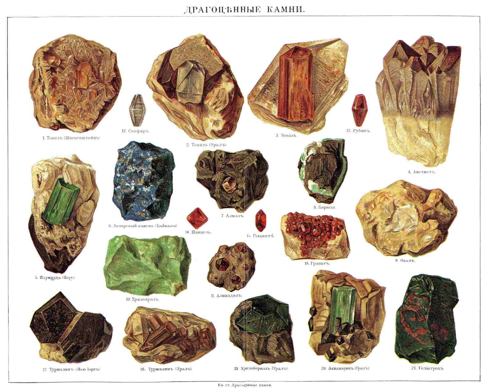 — Этим именем называют минералы, отличающиеся особенным блеском, красотою окраски или совершенною бесцветностью, прозрачностью и твердостью, употребляемые как украшения. Перечисленные свойства в связи с редкостью нахождения в природе обусловливают их ценность; впрочем, некоторые минералы, в древности считавшиеся особенно драгоценными, в настоящее время стоят недорого. Некоторые непрозрачные минералы, обладающие красивой окраской или игрой цветов, также употребляются на украшения. По красоте, редкости нахождения и цене все Д. камни разделяются на 4—5 классов. К первым трем принадлежат собственно Д. камни: 1) алмаз, корунд (рубин и сафир), смарагд (изумруд и аквамарин), шпинель (Rubinbalais); 2) эвклаз, хризоберилл, циркон (гиацинт), фенакит, топаз, благородный опал, гранат (демантоид, альмандин и пирон, или богемский гранат), турмалин (красный, зеленый и голубой); 3) бирюза, хризолит, кордиерит, цианит, андалузит, ставролит, гидденит, аксинит, везувиан, диопсид. Четвертый и пятый классы составляют полудрагоценные камни: 4) кварц (горный хрусталь, аметист и дымчатый топаз), халцедон (оникс, сардоникс, карнеол, хризопраз, гелиотроп), агат, полевой шпат (адулар, лабрадор), лазоревый камень; 5) янтарь, плавиковый шпат, нефрит, малахит, обсидиан, серпентин.