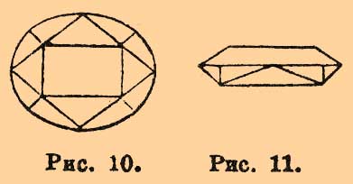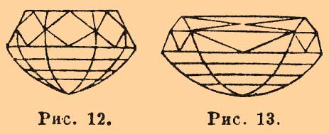 Огранка цветных Д. камней бывает различна в зависимости от формы, в какой Д. камень встречается в природе, а также и от характера спайности. Рубины и сапфиры вышлифовываются обыкновенно в виде таблиц, сверху и снизу ограниченных широкими плоскостями (рис, 10 — сбоку и рис. 11 — сверху). На верхней стороне имеется 8, 12, 16 произвольных, но симметрически расположенных граней; нижняя часть с 4—6 площадками или же представляет одну закругленную плоскость. Когда цветной камень имеет более или менее значительную толщину, тогда многочисленным граням нижней части дают ступенчатое расположение, причем углы между плоскостями делаются тупее и тупее (от рундистов к калетте и таблице). В поперечном сечении камень получает овальную, 4-, 8-, 12-угольную форму. Грани в верхней части располагаются в два, а в нижней — в четыре ряда, редко больше. Особенно красным и светлым цветным камням придают огранку смешанного характера, — одной части (верхней) бриллиантовую, а другой (нижней) лесничную (рис. 12 и 13).