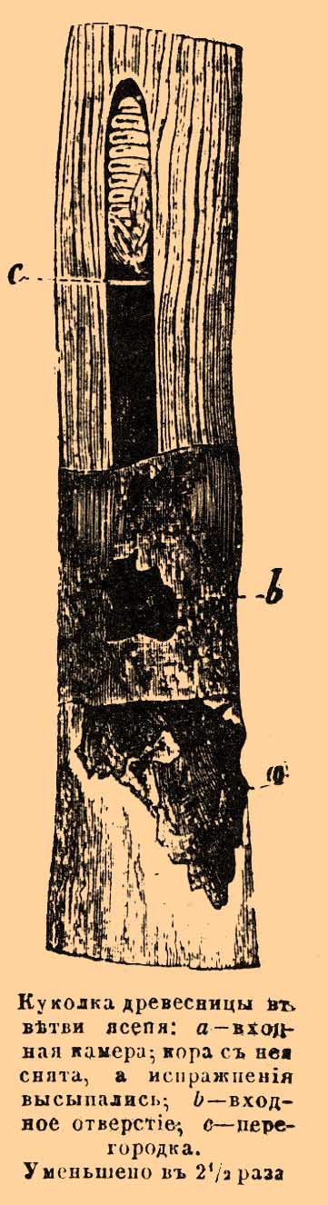 Куколка древесницы в ветви ясеня; а — входная камера; кора с нее снята, а испражнения высыпались, b — входное отверстие, с — перегородка. Уменьшено в 2½ paзa.