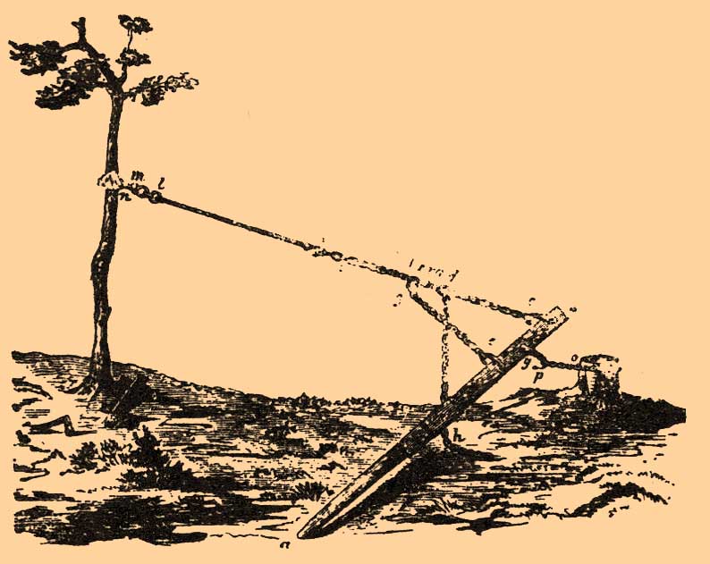 После установки Д., как показано на рисунке, четверо рабочих приближают длинный конец рычага к сваливаемому дереву, и в это время пятый рабочий, стоящий возле крючка d, перемещает его в следующее, ближайшее к дереву, звено цепи trgh. Затем рабочие начинают удалять конец рычага от дерева, отчего цепь сd, прежде туго натянутая, постепенно ослабевает и крючок d может быть перемещен в соседнее звено длинной цепи; потом повторяется движение конца рычага к дереву и перемещение крючка f в ближайшее звено цепи и т. д. Такое изменяющееся движение рычага и попеременное перемещение крючьев d и f из одних звеньев длинной цепи в следующие, ближайшие к сваливаемому дереву, продолжается до тех пор, пока большая часть корней дерева будет выдернута из почвы и ствол дерева повалится на поверхность земли, причем подкладывают возле ствола по направлению его падения кучу поленьев. Давление в один фунт на длинный конец рычага обнаруживает на корни дерева, смотря по длине последних и высоте, на которой укреплена цепь Д. на стволе дерева, давление от 200 до 800 фн. По исследованиям Сиверта, при употреблении швейцарского Д. добывается от 100% до 140% больше массы пней и корней и работа на 40—60% идет быстрее.
