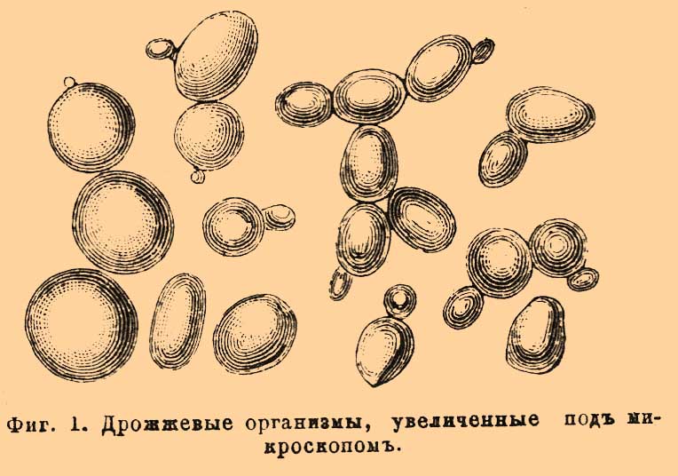— Дрожжами называются особые микроорганизмы (грибки), обладающие способностью возбуждать брожение сахаристых жидкостей (см. Брожение); в общежитии так обозначается вообще тот осадок, который получается в результате спиртового брожения, содержащий, кроме дрожжевых грибков, также и некоторые другие, неорганизованные тела, как, например, свернувшиеся белковые и красящие вещества. Дрожжевые грибки (Saccharomycetes) подразделяются на много видов, из которых наиболее известным и важным в практическом отношении является Saccharomyces Cerevisiae, играющий главную роль при пивоварении и винокурении, а также при хлебопечении. Независимо от деления на виды дрожжи бывают верховые и низовые; первые требуют для своего развития более высокой температуры (optimum = 14—24° Ц.) и представляются в виде многочисленных (5,7 и более индивидуумов) колоний овальных клеток, собирающихся при брожении на поверхность жидкости; низовые же дрожжи собираются внизу бродящей жидкости в виде отдельных, более круглых клеток или небольших (2—3 индивидуума) колоний и проявляют свою деятельность при более низкой температуре (4—12° Ц).