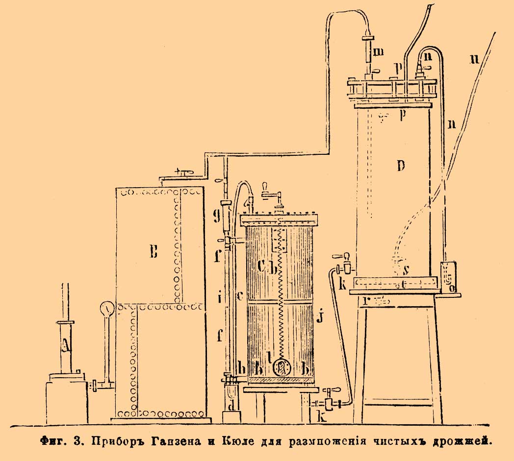 Этим, собственно, и заканчивается лабораторное разведение чистых дрожжей, и дальнейшая работа происходит уже в общем помещении для брожения, т. е. в бродильном погребе. Переходя, подобно описанному, от меньших сосудов к большим, можно распространить брожение с чистыми дрожжами на все производство, но так как при этом невозможно предотвратить заражения дрожжей посторонними микроорганизмами, то приходится время от времени начинать описанную работу сначала, т. е. с приготовления образцов чистых дрожжей. Для избежания этого Ганзен и Кюле устроили особый аппарат, пользуясь которым, можно непрерывно получать большие количества чистых дрожжей (фиг. 3). Аппарат состоит из трех главных частей: 1) из воздушного насоса А, соединенного с воздушным резервуаром В; 2) сосуда С, где происходит брожение и размножение дрожжей, и 3) сосуда для сусла Д. Воздух, необходимый для развития дрожжей, поступая из насоса, проходит в резервуар Д и проводится затем по металлическим трубкам, по желанию, в цилиндр С или в D, проходя при этом через соответственные фильтры — g или m — с хлопчатой бумагой. Аппарат перед употреблением стерилизуется пропусканием через него пара, после чего кипящее сусло прямо из котла проводится в сосуд 2), в котором охлаждается до желаемой температуры посредством холодной воды, поступающей в кольцеобразную трубу p, снабженную мелкими отверстиями, служащими для стока воды по стенкам сосуда; из цилиндра D охлажденное сусло по трубке k поступает в цилиндр С, снабженный мешалкой d с винтообразными лопастями; после того, как часть сусла поступила в цилиндр, в него вводятся по трубке j чистые дрожжи, полученные указанным выше способом. Перебродившее сусло и Д. выпускаются из цилиндра С через кран е. Пивные и вообще всякие дрожжи лучше всего немедленно пускать в употребление; если же этого нельзя, то их следует сохранять в закрытых сосудах в холодном и чистом помещении. Для сохранения же на продолжительное время дрожжей, полученных чистой культурой, Hansen советует помещать их в особые колбы в роде пастеровских (ср. фиг. 2).