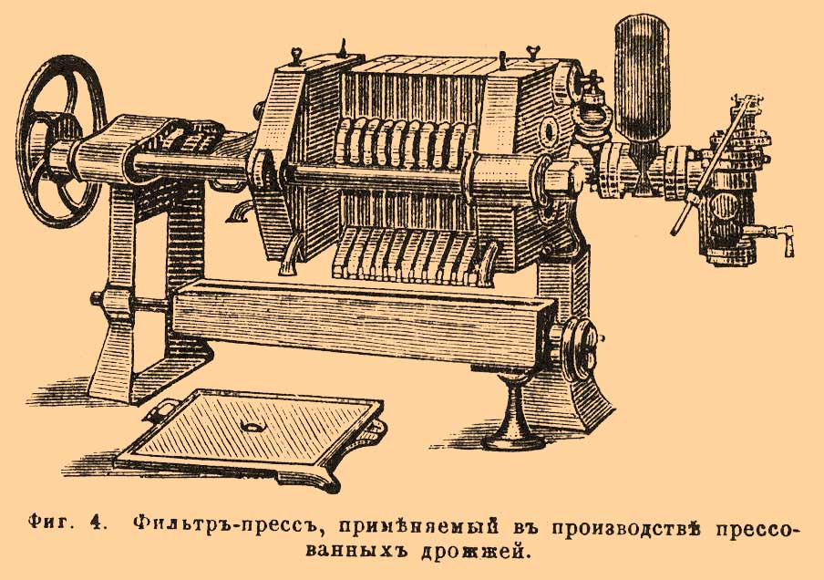 Фиг. 4. Фильтр-пресс, применяемый в производстве прессованных дрожжей.