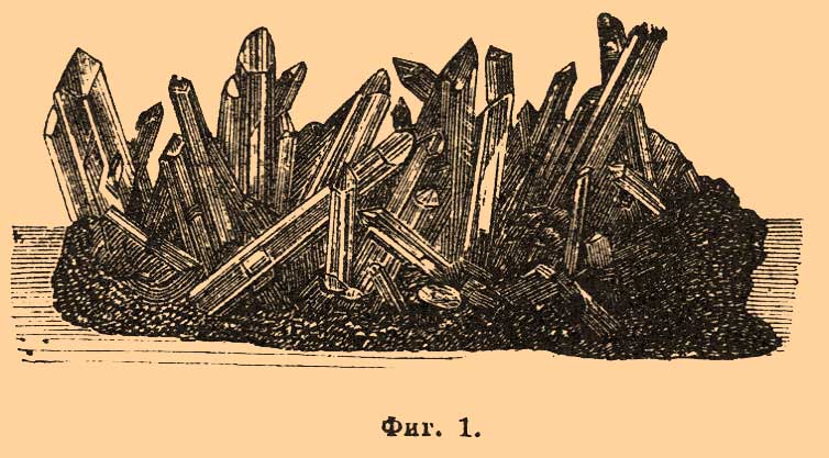 или щетка. — Этим именем в минералогии обозначают группы беспорядочно расположенных кристаллов, сросшихся своими концами с одним общим основанием (фигура 1).