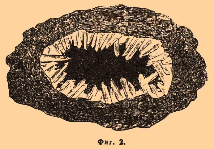 Кристаллы или состоят из того же минерального вещества, как и основание, или же не имеют с ним ничего общего. Примером Д. первого рода могут служить группы кристаллов известкового шпата, сидящих на шестоватом или зернистом известковом же шпате, или группы кристаллов свинцового блеска — на зернистом свинцовом блеске. Примером вторых — кристаллы гипса на глине или кристаллы пирита, покрывающие кварц. Форма Д. весьма разнообразна и зависит от формы свободного пространства (пустоты, трещины и др.), на стенках которого кристаллы вырастают. Если Д. выстилает стенки округленной пустоты в горной породе, то ее называют жеодою (см. рис. 2).