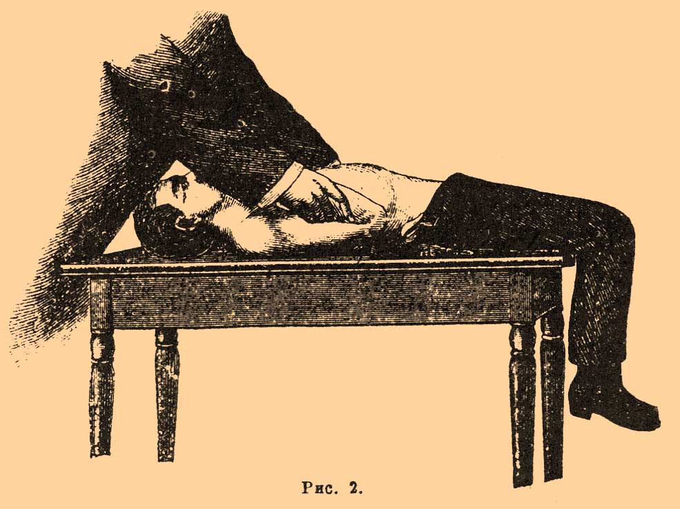 Нужно всегда заботиться о свежем воздухе, открыв окна и двери и удалив праздных зрителей. Необходимо у обмершего расстегнуть или разрезать платье и белье. У засыпанных землею и у утопленников нужно очистить нос и рот от земли, песка, ила, слизи и проч. Язык, весьма часто западающий назад, должен быть вытянут вперед пальцами или же щипцами. Искусственное Д. производится различно: 1) По способу Сильвестра на покатый стол (под передние ножки стола подкладывают брусок, камень и тому под.) или на землю и обмершего кладут на спину и опускаются на колени сзади у его изголовья; затем захватывают обе его руки ниже локтей, поднимают их вверх через голову обмершего (рис. 1) и держат так в течение двух секунд (пока не слышно более, что воздух входит в легкие), после чего отводят руки назад к груди (см. рис. 2), сильно надавливая при этом на область нижних ребер (выдыхание).
