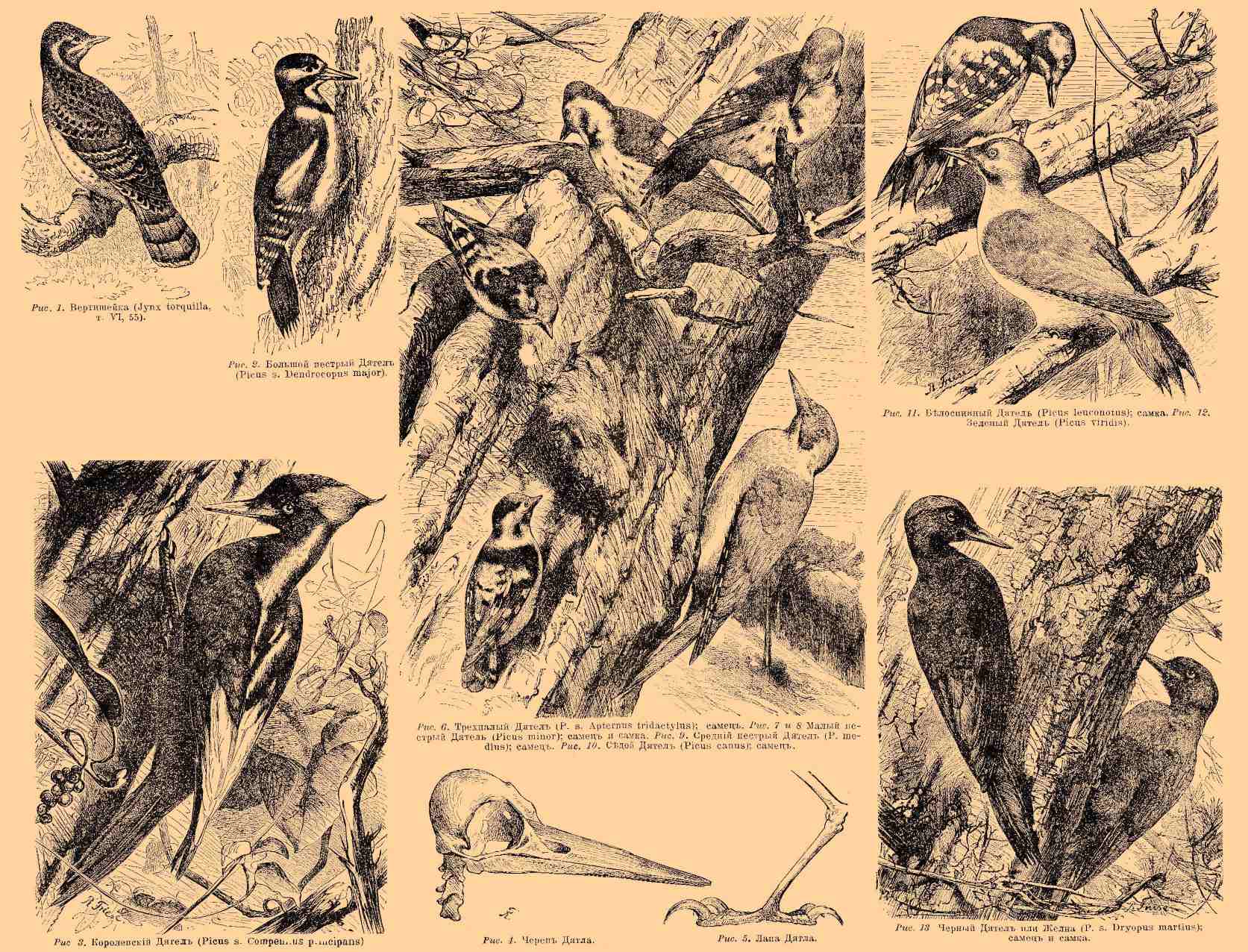 Почти все — лесные птицы; отлично лазают, по земле движутся неуклюжими прыжками; питаются преимущественно насекомыми; некоторые едят также ягоды и семена. Гнездятся в полостях стволов деревьев; птенцы слабы и неразвиты. Кроме сем. вертишеек (см.) и мягкохвостых Д. (Picumnidae), сюда принадлежат настоящие Д. (Picidae), отличающиеся многогранным, на конце долотообразным, клювом, который редко бывает короче головы (рис. 4); языком, спереди заостренным и снабженным обращенными назад остриями, а в задней части — гибким и цилиндрическим; средней длины крыльями; клиновидным хвостом из очень жестких, на концах растрепанных перьев. Известно около 300 видов, распространенных там же, где и весь отряд. Все — лесные птицы, лазающие всегда по стволам снизу вверх, подпираясь хвостом; летают низко и обыкновенно на короткие расстояния. Питаются главным образом насекомыми и их личинками, которых добывают, долбя кору и древесину и всасывая в проточенные насекомыми ходы свой необыкновенно подвижный и гибкий язык; некоторые питаются также ягодами и семенами; так, наш большой пестрый Д. очень любит семена хвойных дерев и добывает их, защемляя зрелые шишки в отверстия в стволах деревьев и разбивая их клювом. Дятлы считаются чрезвычайно полезными лесными птицами, хотя некоторые исследователи считают их вредными, преувеличивая значение повреждений деревьев, истребления семян хвойных деревьев и полезных для леса муравьев. Д. — оседлые или кочующие птицы, живущие обыкновенно поодиночке и вне периода размножения лишь иногда собирающиеся в стада. Самец в период спаривания издает своеобразный трещащий звук, барабаня клювом по сухой ветке или сильно ударяя по ней и приставляя к ней затем свой клюв. Гнездятся в полостях, выдолбленных ими самими в стволах деревьев, самка кладет 3 — 8 белых блестящих яиц и насиживает их вместе с самцом; подстилкой для яиц служат щепки. В Петербургской губернии высиживание в мае. В таких же пустотах Д. ночуют. Д. подразделяются на несколько родов. Самый крупный вид — Д. королевский (Picus s. Campephilus principalis, рис. 3), блестящего черного цвета с белыми полосами и красными висками, хохлом на затылке и верхней части шеи у самца; у самки хохол черный; длина равна 55 см. Центральная Америка и южная часть Сев. Америки. У нас водятся: 1) Черный Д., или желна (Picus s. Dryocopus martius, рис. 13), черного цвета; у самца темя и затылок, у самки только затылок красного цвета; длина 48 см (Европа и Азия до северного склона Гималаев). Предпочитает хвойные леса. 2) Большой пестрый Д. (Picus s. Dendrocopus major, рис. 2); темя, спина, надхвостье и полоски, идущие вниз от углов рта, черные; подхвостье карминно-красное, остальные части и 5 полос на крыльях белые. У самцов затылок красный, у самки черный, у молодых вся верхняя часть головы красная; длина равна 24 см. Вся Европа, Сибирь, Япония. Преимущественно в хвойных лесах. 3) Белоспинный Д. (Р. s. D. leuconotus, рис. 11); нижняя часть спины и надхвостье белые; брюхо и подхвостье розово-красные с черными продольными пятнами; плечи черные; на крыле 6 белых полос; самец с красной, самка с черной верхушкой головы: длина 28 см. Северная и Северо-Восточная Европа и Северная Азия. Лиственные леса. 4) Средний пестрый Д. (Р. s. D. medius, рис. 9); спина, надхвостье и черные полоски, начинающиеся под ухом, черные; подхвостье и часть брюха розово-красные с черноватыми продольными пятнами; темя карминн