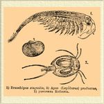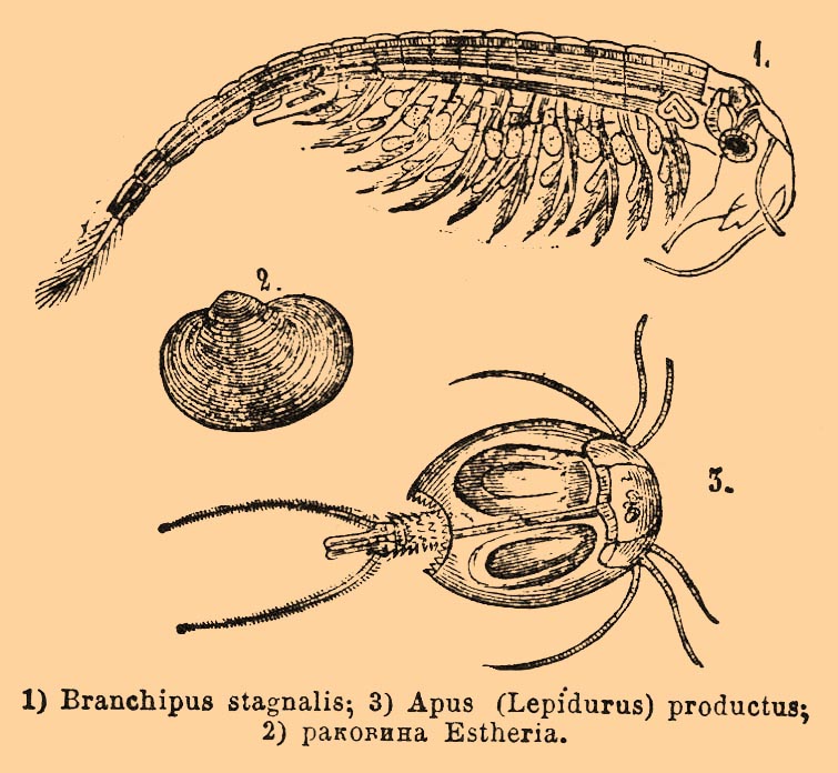 1) Branchipus stagnalis; 2) раковина Estheria; 3) Apus (Lepidurus) productus.