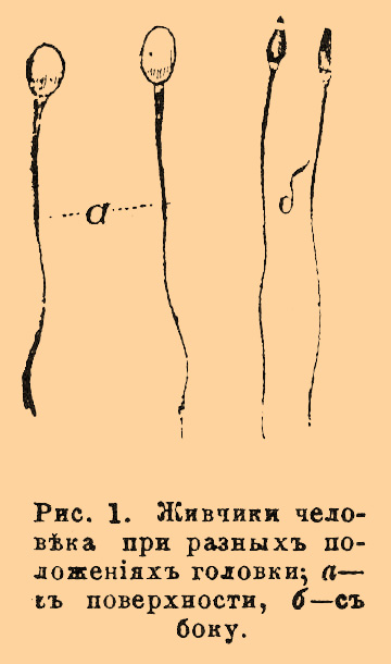 При больших увеличениях в Ж. отличают три части: головку, среднюю часть и хвостик. Головка имеет овальную форму; передняя часть ее несколько сплюснута и широкие поверхности слегка вогнуты, наподобие красного кровяного шарика. Поэтому головка представляет различный вид, смотря по тому, какой стороной она обращена к наблюдателю: в одном случае она имеет грушевидную форму, в другом овальную. Головка состоит из ядерного вещества (хроматина). К ней прикрепляется посредством промежуточной короткой средней части длинный, нитевидный, постепенно утончающийся к концу придаток — хвостик. При помощи быстрых, змеевидно извивающихся движений хвостика Ж. плавает в семенной жидкости. Движения хвостика напоминают движения жгутиков, которыми снабжены многие одноклеточные организмы (например, жгутиковые инфузории), почему самые Ж. можно сравнивать с жгутиковыми клетками. Ж. различных животных отличаются главным образом величиной, затем формой головки и других частей. Внешняя форма живчика часто различна даже у близких животных, например у разных видов лягушек; то же следует сказать и об их величине. Известны даже случаи (Paludina, моллюск из брюхоногих) диморфизма Ж., когда у животного в одной и той же особи встречаются две совершенно развитые и очень отличные друг от друга формы живчиков. В некоторых случаях (например, саламандра, тритон) вдоль хвостика тянется тончайшая перепонка, совершающая волнообразные движения (мерцательная перепонка). Исследования последнего времени (Ballowitz) над Ж. позвоночных и насекомых показали, что хвостик Ж. вообще не представляет собой простой однородной нити. Он заключает именно в себе центральную нить, окруженную особой плазматической оболочкой, которая часто обвивает ее в виде спирали. Центральная нить в свою очередь представляет собой пучок тончайших волоконцев, на которые распадается при соответственной мацерации. Оболочка центральной нити на подобные волоконца не распадается. Однако, у некоторых беспозвоночных мы встречаем резкие отступления от обычного типа живчиков. В некоторых группах животного царства мерцательные клетки вообще отсутствуют в организации; замечательно, что в иных случаях при этом и Ж. теряют свой характер мерцательных клеток. Так, у круглых червей (Nematodes) Ж. являются в форме грушевидных или цилиндрических клеток, снабженных ядром и совершающих слабые амебовидные движения (Рис. 2, 8), у ракообразных это кругловатые, неподвижные клетки, у десятиногих раков с нежными лучистыми отростками (Рис. 2, 9). У насекомых, однако, Ж. нормального типа.