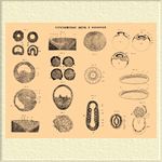 Рис. 1. Образование гаструлы путем выпячивания из бластулы; fh — полость дробления, e — эктодерма, en — энтодерма, bl — бластопор. Рис. 2. Бластула тритона: fn — полость дробления, dz — клетки, набитые желтком. Рис. 3. Разрез через яйцо тритона при начале гастрального втягивания: ak — наружный лист, ik — внутренний лист, fh — полость дробления, ud — archenteron, u -бластопор, dz — желточные клетки. Рис. 4. Разрез через зародышевую полоску цыпленка по окончании дробления (в стадии бластулы): fh — полость дробления, vw — нижняя, dw — верхняя стенка бластулы. Рис. 5. Гаструляция в зародышевой полости птиц: ak — наружный, ik — внутренний лист, dk — желточные ядра, ud — archenteron, hl, vl — губы бластопора. Рис. 6. Образование пластов путем эпиболии (в яйцах червя Bonellia): mi — мелкие клеточки (микромеры), дающие начало эктодерме (ec), ma — крупные клетки (макромеры), образующие энтодерму. Рис. 7. Образование энтодермы путем миграции клеток (в яйце медузы). Рис. 8. Образование пластов путем деламинации (яйцо медузы): morula. Рис. 9 Образование пластов путем деламинации (яйцо медузы): обособление двух пластов. Рис. 10. Схема строения пластов у животных с средним листом в виде мезенхимы: Ec — эктодерма, En — энтодерма, Gc — полость кишечника, Mch — мезенхима. Рис. 11. Зародыш ланцетника (Amphioxus) в оптическом продольном разрезе: V — передний, H — задний конец, ak — наружный, ik — внутренний лист, ud — полость кишки. Образование мезодермы путем отщепления парных (целомических) мешочков (us) от энтодермы: ush — целомическая полость. Рис. 12. Схематический поперечный разрез через животное с двумя мезодермическими листками и вторичною полостью тела: ak — эктодерма, ik — энтодерма, dh — полость кишки. Средний лист (мезодерма) образуется из двух мешочков, прилегающих друг к другу на спинной и брюшной стороне для образования спинного (dM) и брюшного (vM) мезентерия. Каждый мешочек одной стенки прилегает к кишке, образуя висцеральный (кишечный) лист мезодермы, mk2, другою — в коже, образуя париетальный (кожный) листок mk1. В промежутке между обоими листками образуется вторичная (целомическая) полость тела. Рис. 13-15. Последовательные стадии образования зародышевых оболочек у птицы: bl — питательный желток, t — полость кишечника, ek — эктодерма, en — энтодерма, m — мезодерма, am (Рис. 14) — складки, из которых образуются зародышевые оболочки: am (Рис. 15) — амнион, s — сероза, al — аллантоис. 16. Образование зародышевых оболочек у насекомых: 1 — питательный желток, 2 — зародышевая полоска, 3 — эктодермические складки вокруг зародышевой полоски, своим разрастанием образующие оболочки, 4 — наружная зародышевая оболочка, serosa, непосредственно переходящая в эктодерму, покрывающую все яйцо, 5 — внутренняя зародышевая оболочка, amnion, 6 — полость между зародышем и amnion. 17. Зародыш глисты (лентеца широкого Bothricephalus latus), выдавленный из яйца. Ec — эктодерм, Hm — зародышевая оболочка.