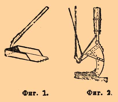 К этому же разряду относятся щипцовые и храповые снаряды, привешенные на цепях к установленному на плавучем помосте подъемному крану. При опускании на дно механизм закрывается как клещи, захватывая грунт (фиг. 5, машина Пристмана).