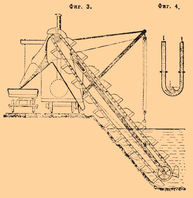 Землечерпательница, представленная на фиг. 3, передвигаемая вдоль берега на колесах, применялась для дноуглубительных работ в порте Кале. Машины этого рода могут работать и в сухом грунте (см. Экскаватор). Механические снаряды для подводной выемки грунта употреблялись еще в XVIII ст. Первая же паровая землечерпательница применена была для работ на р. Кляйд в 1824 г. Обширное применение нашли эти машины при постройке Суэцкого канала; к этому времени относятся также наиболее важные усовершенствования в их устройстве. В настоящее время этого рода машинами пользуются при всех более значительных дноуглубительных работах, как в портах (Морской канал в СПб., Либавский и другие русские порты), так и на реках и каналах (напр. при производящихся в настоящее время работах по углублению канала императора Александра II в СПб. округе путей сообщения). 3) Землесосы, состоящие из углубленной в грунт трубы, из которой выкачивается воздух. Внешнее давление вгоняет жидкий материал в трубу снизу и заставляет его передвигаться к верхнему выпускному отверстию. Снаряд этого рода, состоящий из четырех всасывающих труб, устроенный Ривсом, применен был с успехом при сооружении Тэйского моста. К разряду этих машин принадлежат также песочный насос Жилля, употреблявшийся успешно при заложении шахт и устройстве мостовых опор. На фиг. 4 изображен принцип инжектора, положенный в основание устройства песочного насоса Робертсоном.