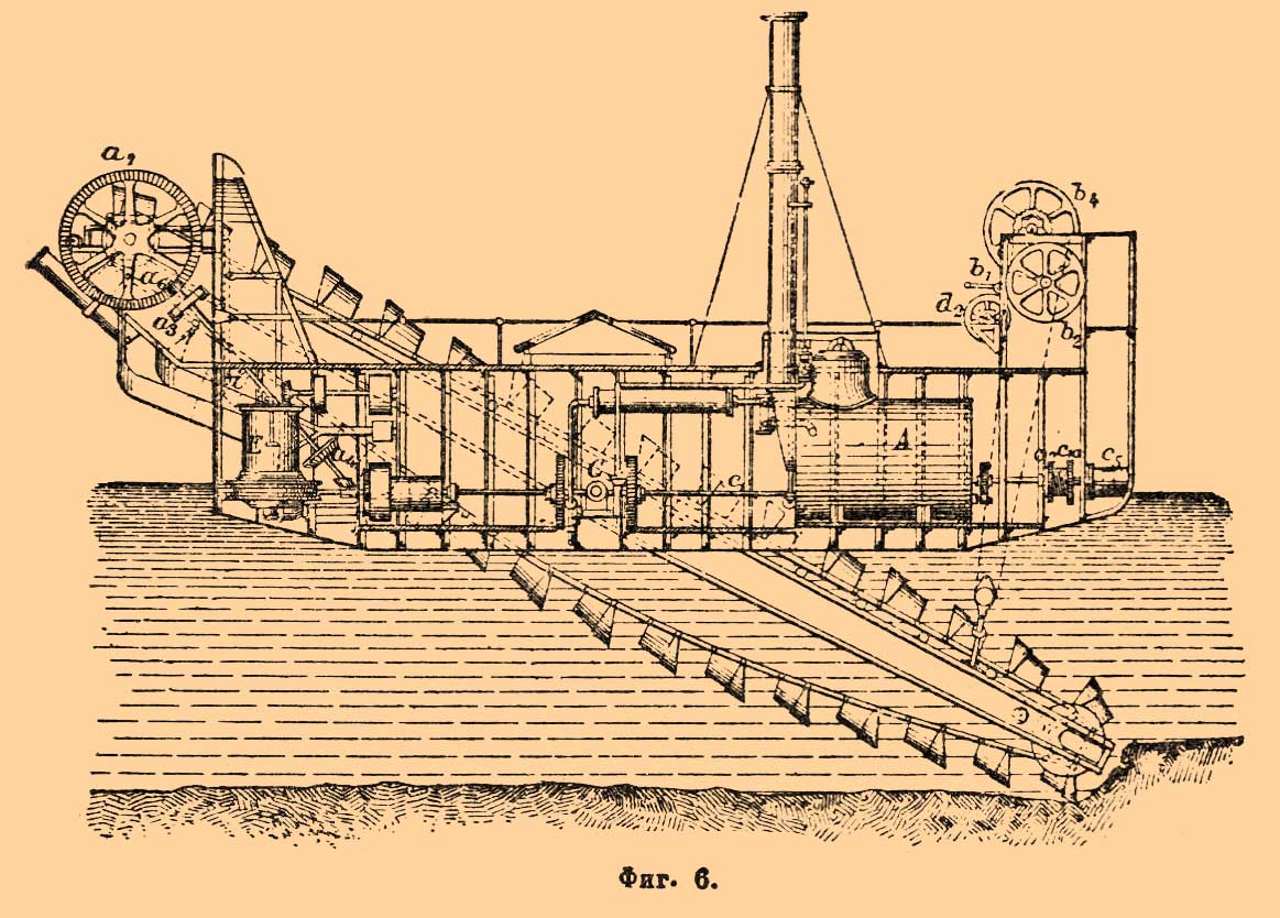 2) Снаряды непрерывного действия, состоящие из ряда черпаков, укрепленных на окружности вращающегося колеса или привешенных к звеньям бесконечной цепи (четочная машина). Машина последнего рода и есть самый распространенный в Европе тип землечерпательницы. Черпаковая рама, к которой привешена цепь с черпаками, расположена или по оси судна, для чего в корпусе его имеется выемка (одиночная землечерпательная машина, фиг. 6), или на обоих бортах судна помещено по раме с черпаками (двойная землечерпательница).