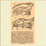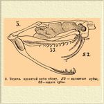 1. Череп ужа (Tropidonotus natrix) сверху (левая сторона черепа не дорисована, передний конец обращен влево). 2. Череп ужа снизу; Tmx — межчелюстная кость (Intermaxillare), М - верхнечелюстная (Maxilla), N — носовая (Nasale), Eth — решетчатая (Ethmoideum), Pf - предлобная (Praefrontale), F — лобная (Frontale), F (правее) — заднелобная (Postfrontale), Pt и Pl - крыловидная (Pterygoideum) и небная (Palatinum), Ts — поперечная (Transversum), P — темянная (Parietale), Squ - чешуйчатая (Squamosum), Qu — квадратная (Quadratum), Pe — каменистая (Petrosum), Ol - боковая затылочная (Occipitale laterale), Dt - зубная кость нижней челюсти (Dentale), Ag — угловая (Angulare), Art. — суставная (Articulare), Vo — сошник (Vomer), Ch — хоаны, Bs — основная (Sphenoideum), Bs — основная затылочная. Сосс — затылочный мыщелок (Condylus occipitalis).