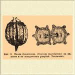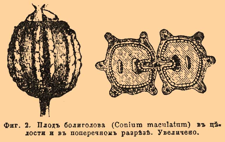 Фиг. 2. Плод болиголова (Conium maculatum) в целости и в поперечном разрезе. Увеличено.