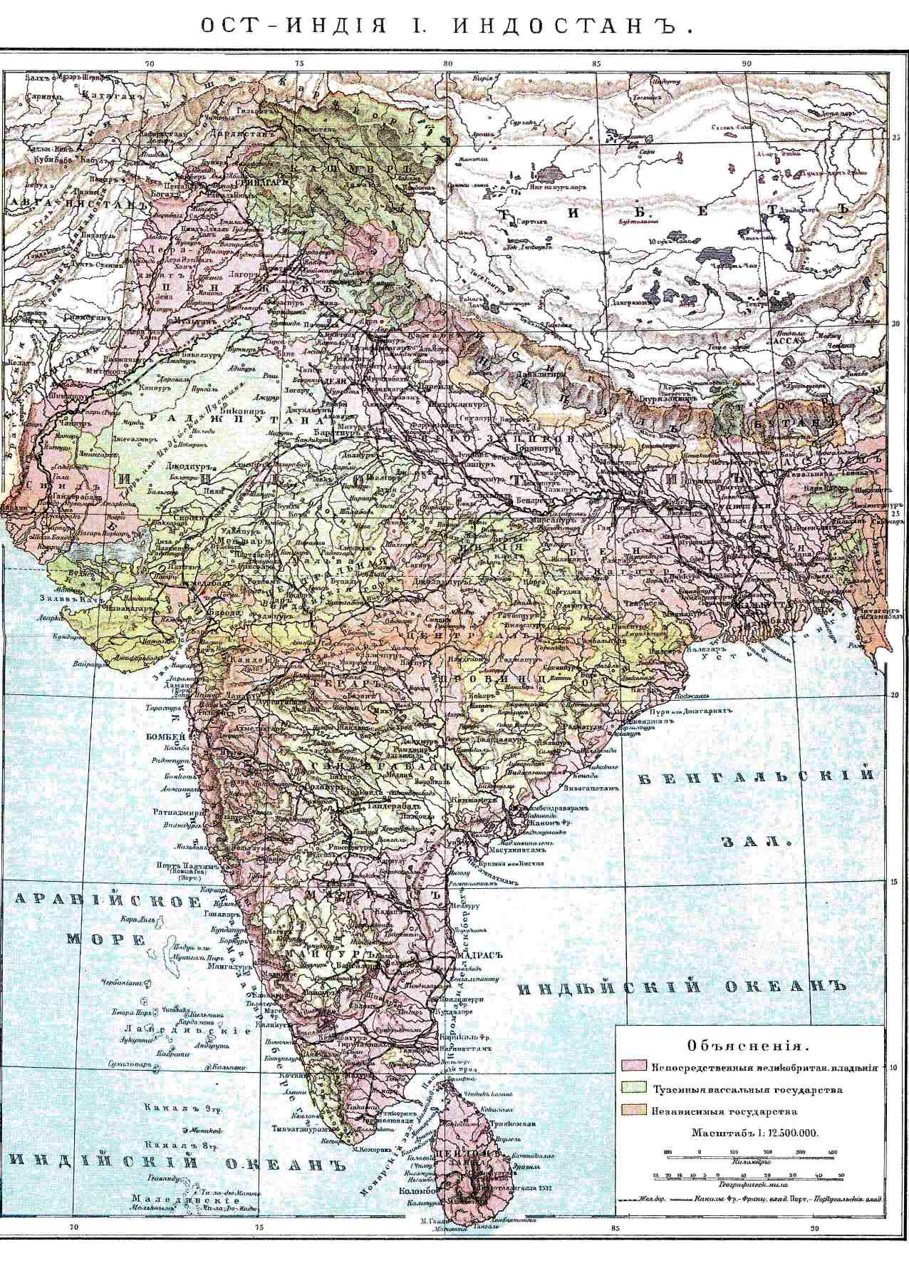 Государственное устройство. Настоящая форма управления Индо-Британской империей установлена в 1858 г., когда все территории И., находившиеся под управлением Ост-Индской К°, перешли под верховную власть королевы Англии, принявшей в 1877 г. титул императрицы И. Представителем королевы служит генерал-губернатор, или вице-король Индии; он назначается обыкновенно на 5 лет и управляет под руководством статс-секретаря по индийским делам. При генерал-губернаторе состоят два совета: исполнительный и законодательный. Первый состоит из 6 членов (считая в том числе главнокомандующего войсками в качестве экстраординарного члена). Каждый из членов совета, фактически назначаемых статс-секретарем И., заведует отдельной отраслью администрации (юстиции, финансов и др.); министерство иностр. дел всегда находится в руках самого вице-короля. Законодат. совет составляется из членов исполнит. совета и из дополнительных членов числом от 6-12, которые назначаются вице-королем частью из лиц англ. происхождения, частью из туземцев. Билли, принятые большинством совета и утвержд. вице-королем, имеют силу закона, но могут быть отменены статс-секретарем по делам Индии. Высшее управление Индийской империей вверено статс-секретарю по делам Индии и состоящему при нем совету из 10 членов, назначаемых на десять лет, по истечении которых срок службы их может быть продлен статс-секретарем еще на пять лет; члены этого совета не имеют права заседать в парламенте и могут быть отрешаемы от должности ранее истечения срока, по требованию обеих палат. Члены совета должны избираться из числа лиц, прослуживших в И. не менее десяти лет и покинувших ее не более чем за 10 лет до своего назначения; только один из 10 членов может не удовлетворять этим условиям. Совет разделяется на комиссии и ведет все дела и сношения Англии с Индийской империей. Все расходы по делам И. подчинены контролю статс-секретаря по делам И. и совету; во внешних сношениях совет не принимает участия, и они ведутся статс-секретарем по индийским делам независимо. Назначение членов совета и губернаторов Бомбея и Мадраса зависит от самой королевы. Вице-губернаторы и главные комиссары других 10 провинций назначаются вице-королем и утверждаются статс-секретарем по делам И. Губернаторства Мадраса и Бомбея (включая Синд) имеют каждое свой совет, свою военную и гражданскую администрацию. Вице-губернаторства Бенгала и сев.-зап. провинций (с Аудом) имеют только отдельный законодательный совет; остальные провинции пользуются меньшей долей самоуправления. Каждая провинция разделена на департаменты, управляемые комиссарами; департаменты делятся на округа, которые и составляют административные единицы; во главе каждого округа стоит главный сборщик податей, который часто вместе с тем и местный судья (collector and magistrate). В административном отношении И. делится на британские и туземные, или вассальные, территории; последние управляются туземными государями. Они по большей части платят дань, обязаны в случае войны присоединять свой контингент к англо-индийским войскам, не содержать более положенного количества войск и, главное, принять резидента, назначенного ген.-губернатором или губернатором. Этот резидент — верховный правитель государства, без его согласия не предпринимается ничего важного. В случае крупных несогласий туз