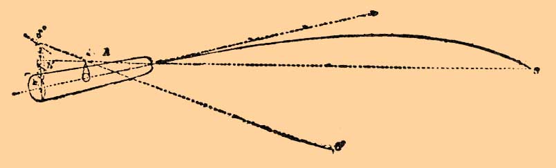 Высота прицела h соответствует расстоянию до цели, а боковое отклонение δ служит для уничтожения деривации (см.) снаряда на данном расстоянии. При только что указанных условиях линия прицеливания будет δ AC, где А вершина мушки. Впереди орудия выбирают некоторый отчетливо видимый предмет С' и, не трогая орудия, наведенного в цель С, передвигают прорезь прицела (вверх или вниз, вправо или влево) до тех пор, пока она не будет находиться на линии C'A; точка С' называется И. точкой прицеливания, а линия прицеливания в эту точку будет δ 'A'C. Если при следующем выстреле вновь установить орудие по линии прицеливания δ 'АC', то ось канала получит такое направление, при котором траектория пройдет через обстреливаемую цель. Прием прицеливания в искусственную точку требует возможной неизменяемости во время стрельбы взаимного положения орудия, цели и И. точки прицеливания, а потому необходимо наблюдать, чтобы орудие с лафетом перед выстрелом занимало прежнее место. Предпочтительнее выбирать И. точку прицеливания не слишком близко от стреляющего орудия. Она может быть не только впереди, но и позади орудия; в последнем случае глаз наводчика располагается перед вершиной мушки и линия прицеливания направляется через вершину мушки, через прорезь прицела на И. точку. Такой прием назыв. обратной наводкой и нередко применяется для орудий береговой артиллерии. Если на местности нет предмета, подходящего для искусственной точки прицеливания, то устанавливается в удобном месте шест, веха, или другой какой-либо знак. При ночной стрельбе из осадных и крепостных орудий искусственной точкой служит потайной фонарь, надетый на веху и обращенный светлым отверстием к орудию.
