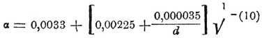 где l — длина трубы, и — периметр еe отверстия, q — еe сечение, а α — коэффициент трения, зависящий от жидкости и от стенок трубки; величина α зависит от скорости V и, по г. Смису (1884), выражается формулой: