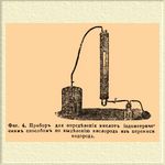 Фиг. 4. Прибор для определения кислот йодометрическим способом по выделении кислорода из перекиси водорода. Потом осторожно вставляют в А пробку и помещают в стакан с водой М. После этого сообщают прибор с атмосферой (вынув кран) и, действуя каучуковым шаром, заставляют воду из сифона подняться в бюретке до 0 и вставляют зажимы. Когда температура в Д уравнялась (температура воды в M и в В приблизительно одинакова), ставят кран на свое место; в приборе таким образом оказывается запертым известный объем воздуха, После этого выливают некоторое количество воды из бюретки, вынимают А из стакана М, осторожно приводят находящуюся в нем жидкость во вращательное движение и потом разом смешивают обе жидкости. Тотчас начинает выделяться кислород. Не переставая вращать, жидкость старательно взбалтывают, потом ставят снова в стакан M и минут через 5—10, приведши воду в бюретке и в манометрической трубке к одному уровню, определяют объем выделившегося кислорода (по разности между вновь наблюденным и прежним, предполагая, что температура и давление не изменялись), замечают и атмосферное давление. По таблицам вычисляют вес кислорода. Опыт кончается довольно быстро. Выделение кислорода продолжается несколько секунд. Ждать с отсчитыванием объема более 1/2 ч. не следует, так как кроме изменения температуры в M и В может произойти выделение кислорода из Н 2 О 2. Для определения кислот Н 2 SО 4, НCl, HNO 3 берут около 2 г KJ и 0,2 KJO3 хорошо измельченного (этого достаточно для получения до 50 куб. см кислорода; если бюретка до 100 куб. см, берут вдвое), помещают в сосуд А, растворяют в небольшом количестве воды и прибавляют известный объем разбавленной кислоты; тотчас выделяется йод; жидкость разбавляют водой до 40—50 куб. см и поступают, как сказано раньше. Результаты вполне удовлетворительны, если придерживаться всех указаний [Первым и необходимым условием для получения хороших данных является полное и быстрое смешивание выделившегося J с Н 2 О 2 и КОН. Дело в том, что KJO, образующ. в первый момент действия КОН на J, крайне непрочна. Она чрезвычайно быстро претерпевает дальнейшее изменение, окисляясь до КJO 3 и не входя во взаимодействие и Н 2 О 2, таким образом результаты получаются ниже, чем следуют.]. Для органических кислот, которые медленно выделяют йод из смеси KJ и KJO 3, реакцию можно ускорить нагреванием; но уже тут теряется та простота, которая отличает этот способ от других.