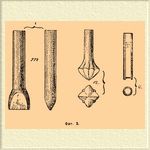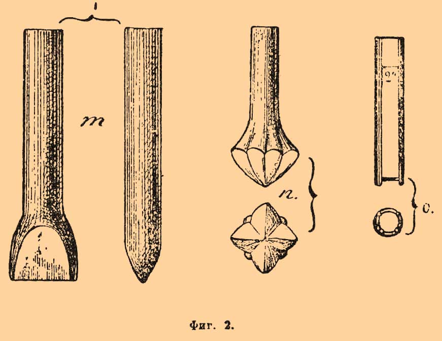 Сверление цилиндров производится стальными сверлами одним, двумя, а иногда и более рабочими; если один и тот же рабочий держит сверло и наносит удары железным кулаком, то работа называется одноручная: более употребительна двуручная, когда один направляет и вращает сверло, а другой наносит удары; самая же успешная — троеручная работа, когда один держит сверло, а двое попеременно бьют молотами. Надо наблюдать, чтобы при каждом ударе сверло поворачивалось не более 1/12 оборота, в противном случае скважина будет иметь нецилиндрическую форму. Для охлаждения нагревающихся сверл вливают понемногу воду, которая смешавшись с каменной мукой, образует грязь, которую вынимают особым железным совком. — По прекращении или остановке в работе отверстие забивается пробкой. Употребляемые для работы инструменты (фиг. 2) сверла, долотообразные (m), называемые забурниками для пород слабых, и коронные (n) — для пород твердых.