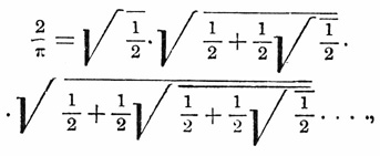 Снеллиус и Гюйгенс в XVII в. указали новые пути, дающие возможность, рассматривая многоугольники с меньшим числом сторон, находить приближения для π гораздо скорее и с большим числом десятичных знаков. Однако вычислительные приемы сделались еще проще с тех пор, как для величины π начали открывать формулы, составленные из бесконечного повторения операций над известными числами. Первая мысль отыскать такие формулы принадлежит Виету; он дал ряд