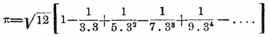 по которому и вычислил сам величину π до 4-х десятичных знаков. Валлис дал другое замечательное произведение (см. Валлис), а Грегори и независимо от него Лейбниц открыли ряд: π /4 = 1 — 1/3 + 1/5 — 1/7 + 1/9 — 1/11 +... Оригинальный ряд, откуда получается предыдущий как частный случай, есть arctg a = a — 1/3a3 + 1/5a5 — 1/7a7 +..., где а есть тангенс центрального угла в круге, которого радиус равен единице. На основании этого ряда легко составить и такой: π /4 = (a + b + c +....) — 1/3(a3 + b3 + c3 +...) + 1/5(a5 + b5 + c5 +...) —..., где а, b, с,... суть тангенсы углов, которых сумма равна 45°. Выбрав а, b, с,... малыми, легкими для обработки и удовлетворяющими поставленному условию углами, получаются вообще весьма удобные для вычисления ряды. По этому способу лондонский проф. Мехин в 1706 г. вычислил π с 100 десятичными знаками. Он положил a = b = c = d = 1/5 и е = -1/239, т. е. употребил ряд: π /4 = 4[1/5 — 1/(3∙53) + 1/(5∙53) — 1/(7∙53) +...] — [1/239 — 1/(3∙2393) + 1/(5∙2395) —...]. До сих пор это лучшая и удобнейшая формула для приближенного вычисления π. Тем не менее, открывают и новые ряды; так, лорд Брункер представил π в виде непрерывной дроби: