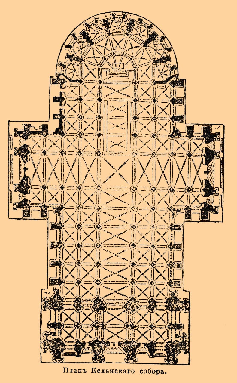Продольный корпус, состоящий из пяти нефов, пересекается трехнефным трансептом, сильно выступающим своими концами из общего плана, и по переходе за трансепт образует своим средним нефом продолговатый хор, между тем как боковые нефы закругляются позади хора и образуют круговой обход с венцом семи капелл. Длина всего здания снаружи — 135,6 м; ширина — 61 м, а в трансепте — 86,25 м. Площадь, занимаемая внутренностью собора, равняется 6166 кв. м, так что в отношении ее величины К. собор уступает только соборам св. Софии в Константинополе, св. Павла в Лондоне, Миланскому и св. Петра в Риме. Во всем расположении собора видна большая ритмичность, а в его конструктивной системе строгая последовательность. Вышина здания от земли до начала крыши — 46 м, а до ее гребня — 61, 5 м. Над тем местом, где продольный корпус перекрещивается с трансептом (над так назыв. Vierung), высится центральная башня с сквозной остропирамидальной вершиной, поднимающеюся на 109,8 м от земли. Две другие башни (колокольни), также остроконечные и пирамидальной формы, стоящие по краям западного фасада, тянутся вверх словно исполинские окаменелые хвойные деревья, ростом в 156 м каждое. Это — самые высокие церковные башни в целой Европе. Колоссальная масса здания убрана снаружи множеством опорных пилястр, аркбутанов, фиалов, башенок, вимпергов, горгулий, галерей, сквозных решеток и пр. При входе чрез западный главный портал, богато украшенный скульптурной работой, но, к сожалению, слишком узкий, внутренность собора благодаря простоте сводов продольного корпуса производит впечатление величественности, которое тем более усиливается, чем ближе подходишь к высокому, стремящемуся к небесам хоровому пространству и видишь идущий вокруг храма пояс красивого трифория и верхних окон.