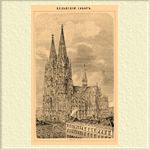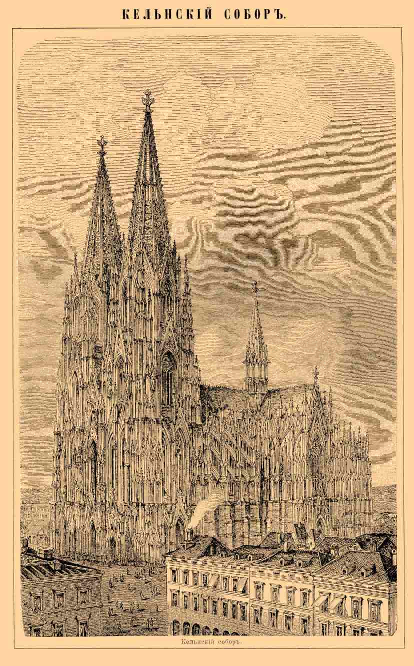 — величественнейший и громаднейший из памятников готического зодчества в Германии. Он был заложен при архиепископе Конраде фон Гохстедене, в 1248 г., по плану "каменных дел мастера" Гергарда фон Риле, на месте существовавшего с IX столетия и сгоревшего в упомянутом году старого собора во имя св. ап. Петра. Постройка началась с хоровой части, но подвигалась вперед очень медленно, так что эта часть получила нынешний свой вид и была освящена только в 1322 г. После этого прежний, продольный корпус был снесен, и приступлено в 1347 г. к возведению нового, а также двух башен по краям зап. фасада, причем первоначальный план храма подвергся некоторому изменению, как о том можно заключить из того, что сравнительно небольшая длина продольного корпуса не соответствует обширным размерам хора и трансепта, а нижние ярусы башен наполовину закрывают крайние западные окна продольного корпуса. Лишь в 1437 г. южная башня поднялась от земли настолько, что можно было повесить на ней колокола. С тех пор ее дальнейшая кладка была совершенно оставлена, и на верхней платформе этой башни в течение четырех веков (до 1868) торчал огромный журавль, служивший для поднимания на нее строительных материалов — печальный признак города, видимый издали подъезжавшими к нему. В XVI стол. продольный корпус был отстроен, по крайней мере до такой степени, что в окна его северного нефа вставили знаменитые расписные стекла. Затем всякие работы по собору прекратились, и неоконченное здание стояло многие годы в виде мрачных, запущенных развалин, которые в 1794 г., во время занятия Кельна французами, были даже обращены в склад сена. Когда в начале текущего столетия пробудилось у немцев национальное сознание и вследствие того усилилось уважение к отечественной старине, заброшенное исполинское сооружение наконец обратило на себя внимание просвещенных людей и явилась мысль о его довершении, на которую в особенности навели бр. Буассери. Мысль эта сначала казалась чересчур смелой, неосуществимой. Представлялось неотложным по крайней мере предохранить собор от окончательного разрушения и исправить уже существовавшие его части. Король прусский Фридрих-Вильгельм III в 1821 г. ассигновал на эту реставрацию особые денежные средства и возложил ее производство на архитектора Алерта, по смерти которого в 1833 г. заведование ею перешло к Эрнсту Цвирнеру. Этот последний по восшествии на прусский престол короля Фридриха-Вильгельма IV (в 1840 г.) сумел заинтересовать последнего проектом полной достройки собора и склонил его взять под свое покровительство основанное в 1842 г. общество содействия этому предприятию. Торжественная закладка достройки происходила 4 сентября 1842 г. С тех пор работы пошли столь быстро, что в 1848 г., при праздновании 600-летней годовщины основания собора, можно было освятить его южный боковой неф. На место умершего в 1861 г. Цвирнера строителем был назначен Рихард Фойгтель. Через два года он окончил отделку внутренности храма и предоставил его богослужению, после чего дальнейшие работы обратились исключительно на пластические украшения внешности здания, в особенности его роскошного южного портала, и на отделку двух колоссальных башен с их порталами. Они приняли вид, согласный со старыми оригинальными чертежами, найденными в 1814 г. Моллером в Дармштадте, и, будучи увенчаны крестоцветными 