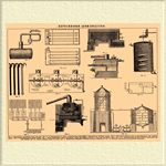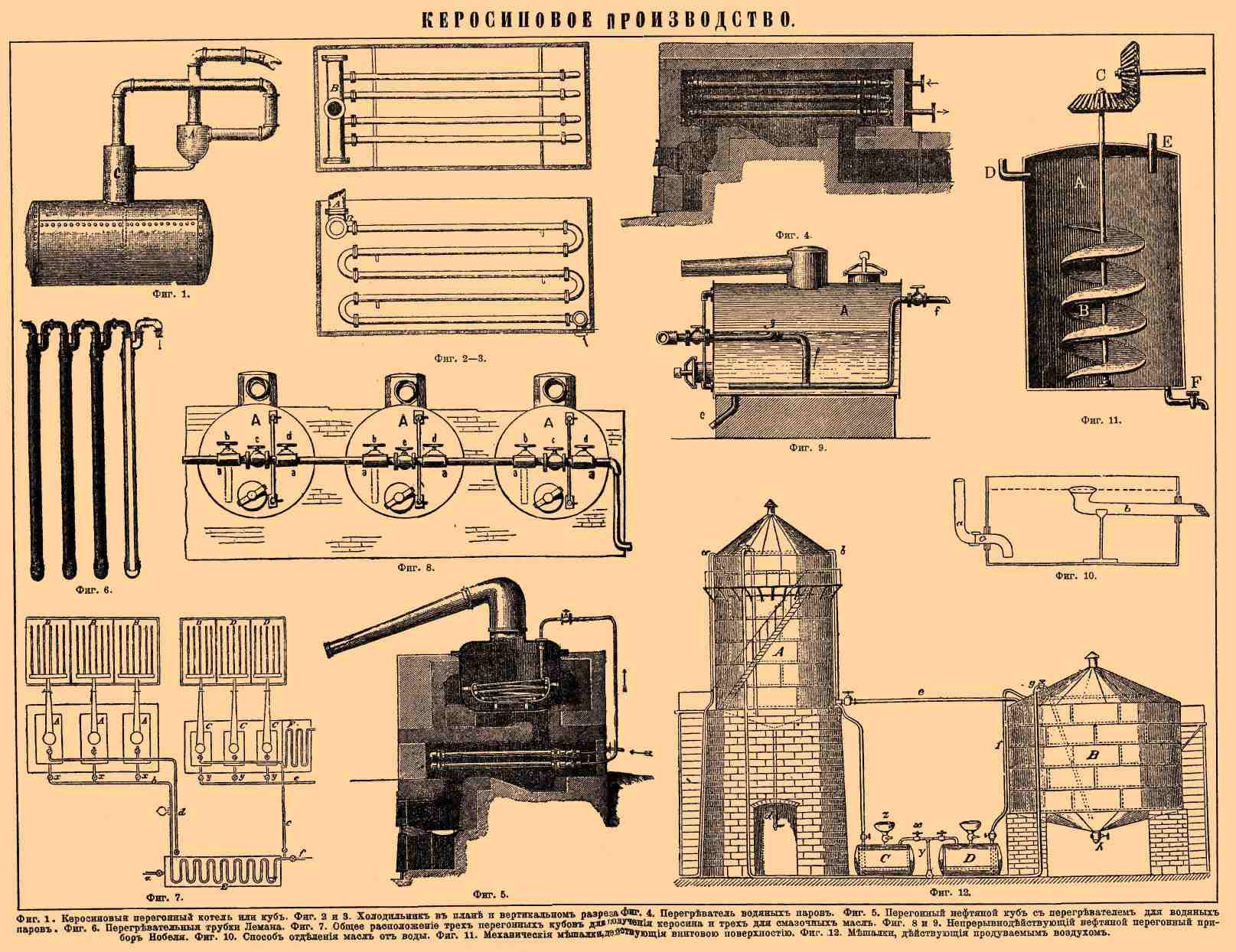 Фиг. 1. Керосиновый перегонный котел или куб. Фиг. 2 и 3. Холодильник в плане и вертикальном разрезе. Фиг. 4. Перегреватель водяных паров. Фиг. 5. Перегонный нефтяной куб с перегревателем водяных паров. Фиг. 6. Перегревательные трубки Лемана. Фиг. 7. Общее расположение трех перегонных кубов для получения керосина и трех — для смазочных масел. Фиг. 8 и 9. Непрерывно действующий нефтяной непрерывный прибор Нобеля. Фиг. 10. Способ отделения масел от воды. Фиг. 11. Механические мешалки, действующие винтовой поверхностью. Фиг. 12. Мешалки, действующие продуваемым воздухом.