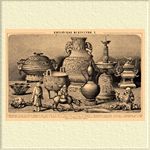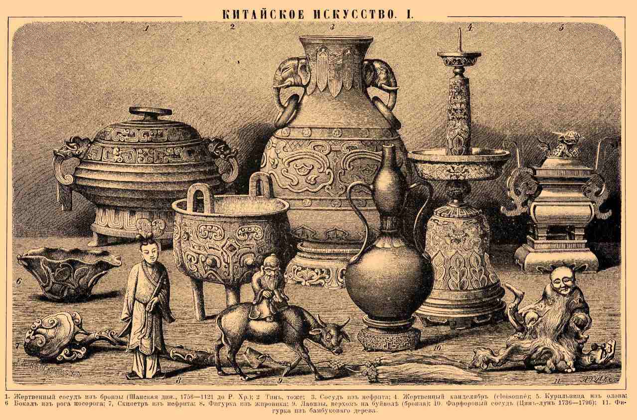 1. Жертвенный сосуд из бронзы (Шанская династия 1756—1121 до Р. Х.). 2. Тин (то же). 3. Сосуд из нефрита. 4. Жертвенный канделябр (cloisonn é). 5. Курильница из олова. 6. Бокал из рога носорога. 7. Скипетр из нефрита. 8. Фигурка из жировика. 9. Лао-цзы верхом на буйволе (бронза). 10. Фарфоровый сосуд (Цянь-лунь, 1736—1796). 11. Фигурка из бамбукового дерева.