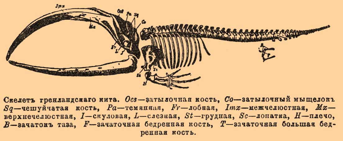 Скелет гренландского кита. Ocs — затылочная кость, Co — затылочный мыщелок, Sq — чешуйчатая кость, Pa — теменная, Fr — лобная, Imx — межчелюстная, Mx — верхнечелюстная, I — скуловая, L — слезная, St — грудная, Sc — лопатка, H — плечо, B — зачаток таза, F — зачаточная бедренная кость, T — зачаточная большая бедренная кость.