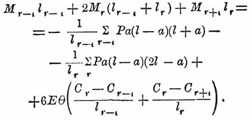 где E — коэффициент упругости материала бруса, а Θ — момент инерции поперечного его сечения относительно оси, проходящей через центр тяжести. Эта формула дана была Клапейроном в первый раз ("Comptes Rendus", 1857) для случая, когда все опорные точки расположены в одной горизонтальной плоскости, следовательно, без члена, заключающего множитель ЕΘ . Понижение некоторых опор, которое на практике может произойти и случайно, от осадки и других причин, приводит к существенным изменениям в распределении усилий, сравнительно с тем случаем, когда все опоры расположены на одинаковой высоте. Поэтому Кепке (см.) ввел в формулу последний член, обобщивший ее и для указанного случая. Наконец, Вейраух ("Allgemein Theorie und Berechnung der continuirlichen und einfachen Tr ä ger", Лейпциг, 1873) вывел формулу, подобную уравнению К., и для случая нагружения балки рядом сосредоточенных грузов:
