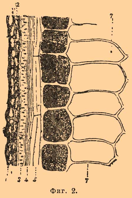 На фиг. 2 (цифра 6) изображен К. слой пшеницы в разрезе, нормальном к поверхности зерна; форма клеточек почти квадратная, сторона квадрата около 0,060 мм; у зерен ржи тот же слой тоже однорядный, но клеточки несколько растянуты в направлении, нормальном к поверхности зерна, длинные стороны их бывают от 0,0528 до 0,0660 мм, а короткие — от 0,0220 до 0,0308 мм; у овса те же клеточки растянуты в том же направлении еще более и образуют также однорядный слой.
