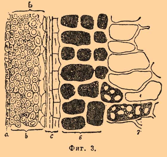 На фиг. 2 цифры 1, 2, 3, 4, 5 представляют слои или оболочки, расположенные над К. слоем 6, а цифрой 7 обозначены большие и тонкостенные клетки внутренней части зерна, наполненные большими и малыми зернышками крахмала и очень мелкими зернышками клейковины или клебера; на фиг. 3 буквами a и b обозначены наружная и внутренняя пленки ячменного зерна, под которыми находится группа оболочек c, цифры 6 и 7 обозначают то же, что и выше. Название К. слоя, придаваемое рассматриваемой оболочке (Perisperm), основывается на довольно распространенном мнении, что содержащиеся в клеточках этого слоя очень маленькие желтоватые крупинки содержат азотистое вещество, клейковину; мнение это, однако, не разделяется некоторыми исследователями, которые доказывают, что в К. слое совсем нет клейковины или клебера и что вообще в этом слое не находится азотистых веществ. При действии на пшеничные зерна реактивом Миллона, представляющим по возможности нейтральный раствор окиси ртути, замечается наиболее сильное окрашивание в красный цвет в темных слоях мучнистой части зерна, ближе лежащих к его оболочкам, что указывает на большее содержание в этих частях зерна азотистых веществ; изолировать же рассматриваемую оболочку от соседних и от внутренней мучнистой части, для непосредственного ее исследования, оказывается крайне затруднительным, чем и объясняется несогласие в мнениях относительно ее химического состава.