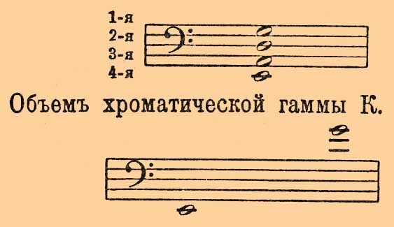 Все написанное звучит октавой ниже. В оркестровой партитуре пишется одна партия К. в ключе фа. Более низкие звуки — полного, густого тембра; высокие ноты довольно резки. К. — не мелодический инструмент. Вследствие неясной интонации он требует поддержки виолончели или духовых инструментов низкого строя, в унисон или октаву. На К. применяются естественные флежолеты, но весьма редко. Двойные струны применяются, но преимущественно при участии хотя бы одной пустой струны, тройные — непременно при участии двух пустых струн. Хорошим звуком отличается пиччикато на К.