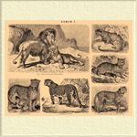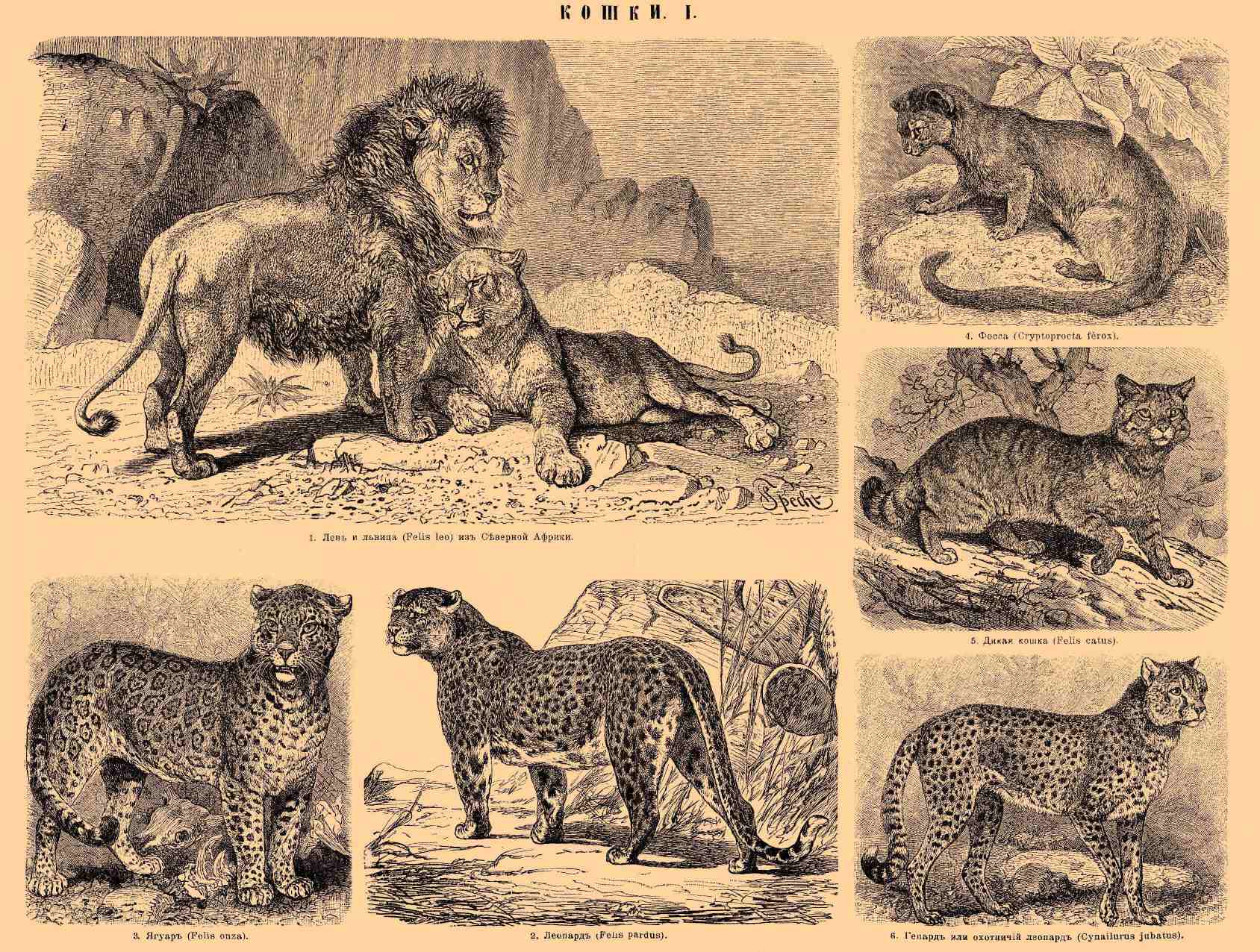 1. Лев и львица (Felis leo) из Северной Африки. 2. Леопард (Felis pardus). 3. Ягуар (Felis onza). 4. Фосса (Cryptoprocta ferox). 5. Дикая кошка (Felis catus). 6. Гепард или охотничий леопард (Cynailurus jubatus).